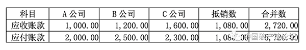 举例:A、B、C三家公司合并破产重整,应收账款账面数据分别为1000万元、1200万元、1600万元,应付账款账面数据分别为2000万元、2500万元、2300万元。其中A公司对B公司应收200万元,A公司对C公司应收380万元,C公司对B公司应收500万元,此时关联方之间的债权、债务合计为1080万元,合并后的债权、债务仅体现对非合并范围内关联方及非关联方的数据,合并后数据如下: