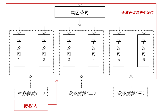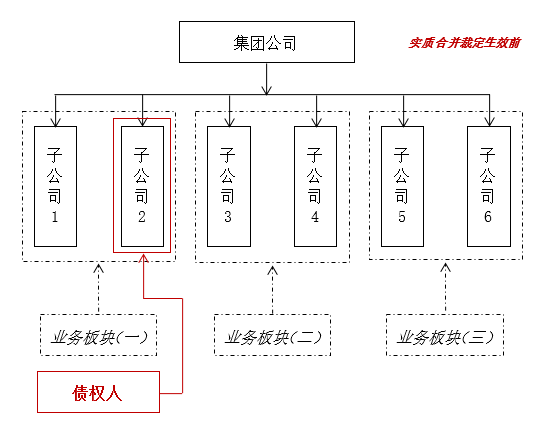 根据《破产审判纪要》、图1及上图(以下简称“图2”)所示,在集团公司整体实质合并破产裁定作出前,债权人对集团公司在合并破产裁定生效前的下属业务板块(一)中的子公司2享有债权。在集团公司整体实质合并破产的裁定作出前,子公司2的全部资产,由债权人、其他债权人及股东一道共同享有对子公司2破产财产的请求权/剩余请求权,股东的剩余请求权作为劣后权利为债权人及其他债权人提供内部増信担保。而在实质合并破产裁定作出后,由于整个集团公司的实质合并,导致债权人对子公司2的债权变成了对实质合并破产主体的债权,相应的原由债权人和其他债权人在子公司2破产财产范围内享有的较子公司2股东(既集团公司)优先分配的权利“重组”为由债权人和集团公司合并财务报表范围的其他全体债权人在集团破产财产的范围内与集团公司股东一道对实质合并破产主体的破产财产享有请求权/剩余请求权,集团公司实质合并后股东的剩余请求权作为劣后权利为债权人和集团公司合并财务报表范围内的全体债权人提供内部増信担保。