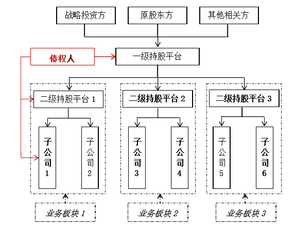 在图3中所述架构中,原集团实质合并破产的各个子公司被重组为三个业务板块,并由一级持股平台根据业务板块分别设立三个二级持股平台持有原集团的各个下属子公司。在整个架构的最上方,则是由战略投资方与原股东及其他财务投资人或者选择转股的部分原债权人等组成的最终投资人。