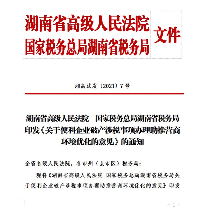 湖南省高级人民法院会同国家税务总局湖南省税务局制定出台印发《关于便利企业破产涉税事项办理助推营商环境优化的意见》的通知,提出五项措施解决破产企业税务办理难问题。
