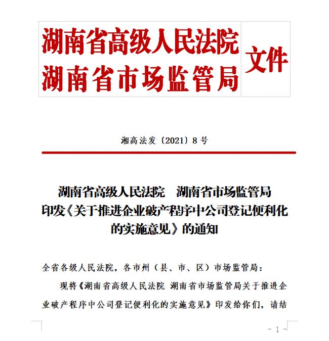 湖南省高级人民法院会同湖南省市场监管局制定出台印发《关于推进企业破产程序中公司登记便利化的实施意见》的通知,提出五项措施解决破产企业注销难问题。
