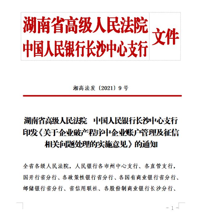 湖南省高级人民法院会同中国人民银行长沙中心支行印发《关于企业破产程序中企业账户管理及征信相关问题处理的实施意见》的通知,提出十二项具体措施,解决破产企业账户管理难问题。
