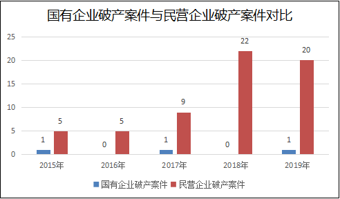 五年以来,自贡法院受理的破产案件中,国有企业的数量与2015年以前相比呈现出明显减少的特征。据统计,2011年全市法院受理破产案件6件均为国有企业;2013年全市法院受理国有企业破产案件9件;2015年、2017年、2019年,国有企业破产案件分别为1件;2016年、2018年分别为0件。与此同时,2015年至2019年民营企业破产案件的数量分别为5件、5件、9件、22件、20件。这一特点显示自贡市国有企业破产清理工作已经进入尾声。