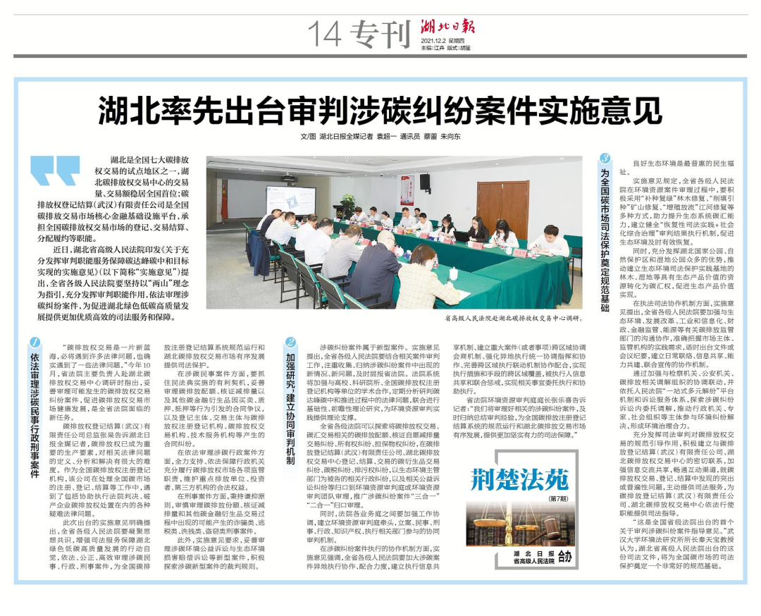 省法院环境资源审判庭庭长张乐喜告诉记者:“我们将审理好相关的涉碳纠纷案件,及时归纳总结审判经验,为全国碳排放注册登记结算系统的规范运行和湖北碳排放交易市场有序发展,提供更加坚实有力的司法保障。”