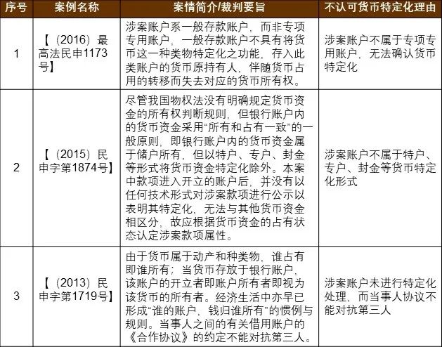综合现行规定及司法实践案例,人民法院目前探讨货币特定化主要是在执行异议/执行异议之诉审理中,且通常是以银行账户是否属于专户、特户等特定化特征来判断,并没有对货币特定化提供统一的判断标准。