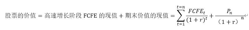 其中:FCFEt=第t年的股权自由现金流(净利润+折旧-资本性支出-营运资本追加额-债务本金偿还+新发行债务);r=高速增长阶段股权投资者的要求收益率;Pn=高速增长阶段期末的股票价值。