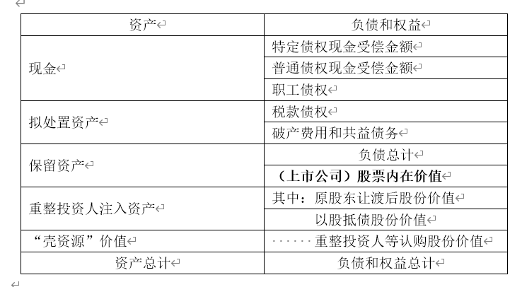 利用资产负债表的结构,在存量资产中拟处置资产变现清偿、重整投资人认购权益调整的股份从而注入现金和资产、存量资产中保留资产和重整投资人注入资产未来经营的情况下,模拟的简明资产负债表的架构如下: