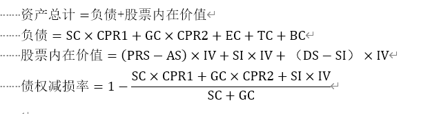其中:TA=资产总计;SC=特定债权总额;GC=普通债权总额;CPR1=特定债权现金受偿率;CPR2=普通债权现金受偿率;EC=职工债权;TC=税款债权;BC=破产费用和共益债务;PRS=重整前股份总数;AS=让渡股份;IV=每股内在价值;SI=以股抵债股份;DS=让渡/转增等重整调整股份,用于以股抵债、重整投资人认购等。