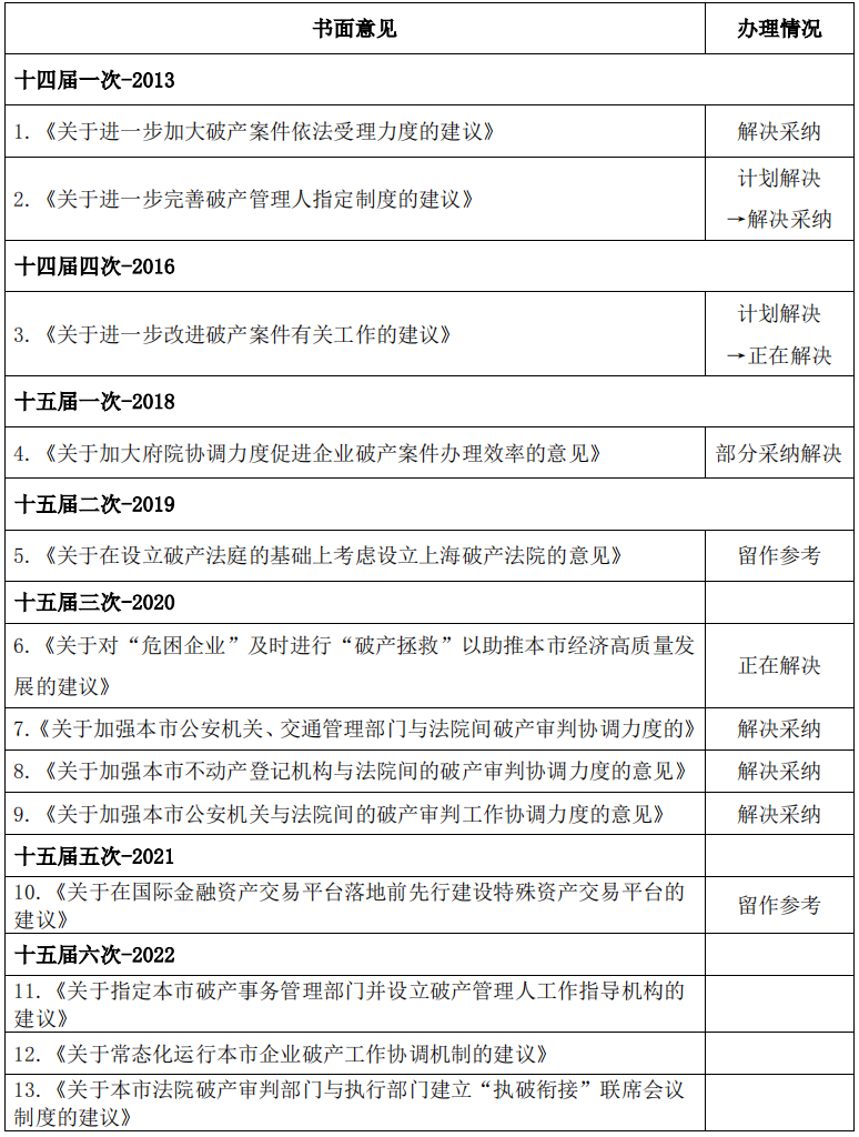 附:刘正东代表自2013年以来提交的有关解决企业破产难方面的代表书面建议清单