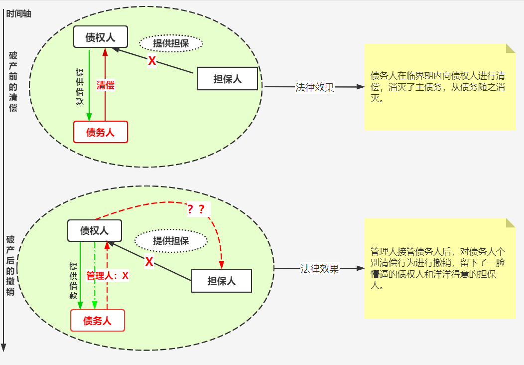 债务人在临界期内的债权清偿行为,导致主债务和担保债务消灭;债务人进入破产程序后,管理人依法撤销了债务人临界期内个别清偿行为,那么债权人对担保人是否还享有权利?如图一: