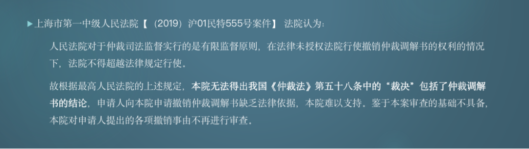 上海市第一中级人民法院【(2019)沪01民特555号案件】 法院认为:人民法院对于仲裁司法监督实行的是有限监督原则,在法律未授权法院行使撤销仲裁调解书的权利的情况下,法院不得超越法律规定行使。《最高人民法院关于人民法院办理仲裁裁决执行案件若干问题的规定》虽然第一条将仲裁调解书的执行案件包含在仲裁裁决执行案件的范围之内,但在其他条款中将仲裁裁决和仲裁调解书作出了明确的区分,尤其是针对当事人申请不予执行的相关规定,更能看出人民法院对于仲裁裁决和仲裁调解书的司法监督是有所不同的,故根据最高人民法院的上述规定,本院无法得出我国《仲裁法》第五十八条中的“裁决”包括了仲裁调解书的结论,申请人向本院申请撤销仲裁调解书缺乏法律依据,本院难以支持。鉴于本案审查的基础不具备,本院对申请人提出的各项撤销事由不再进行审查。