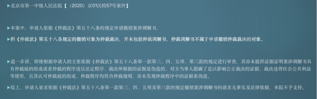 本案中,申请人依据《仲裁法》第58条的规定申请撤销案涉调解书,但《仲裁法》第五十八条规定的撤销对象为仲裁裁决,并未包括仲裁调解书,仲裁调解书不属于申请撤销仲裁裁决的对象。退一步讲,即使根据申请人的主张依据《仲裁法》第五十八条第一款第三、四、五项、第三款的规定进行审查,其亦未提供证据证明案涉调解书具有仲裁庭的组成或者仲裁的程序违反法定程序、裁决所根据的证据是伪造的、对方当事人隐瞒了足以影响公正裁决的证据、裁决违背社会公共利益等情形,且其认可仲裁庭的组成、仲裁程序均符合仲裁规则,亦未发现仲裁程序中的证据系伪造。