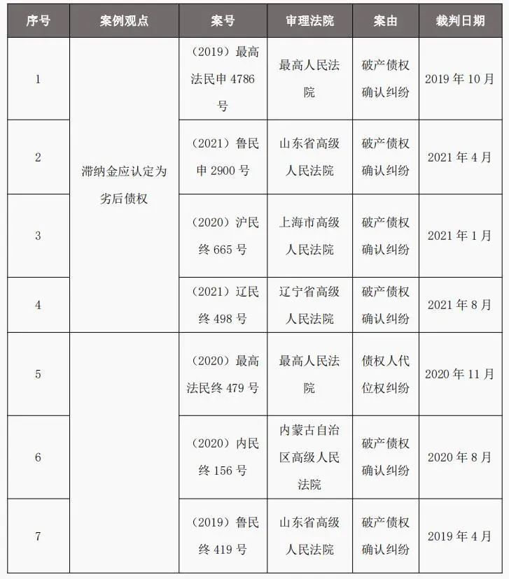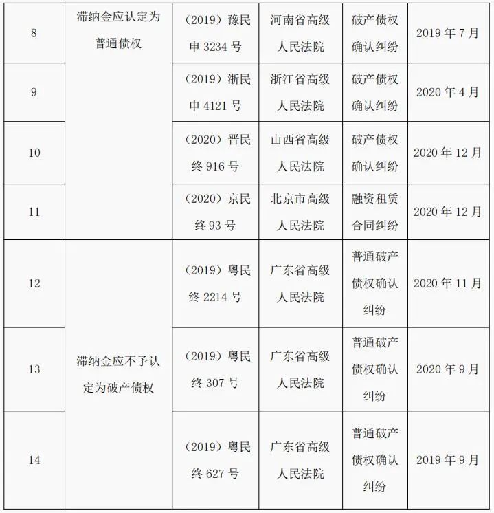 1、最高人民法院及各地高级人民法院审理的相关案件共有14件,其中:滞纳金被认定为劣后债权的共有4件案例、被认定为普通债权的共有7件案例、被不予认定为破产债权的共有3件案例。