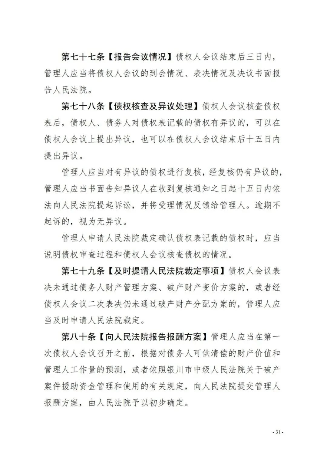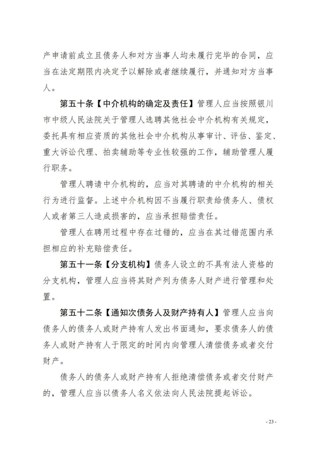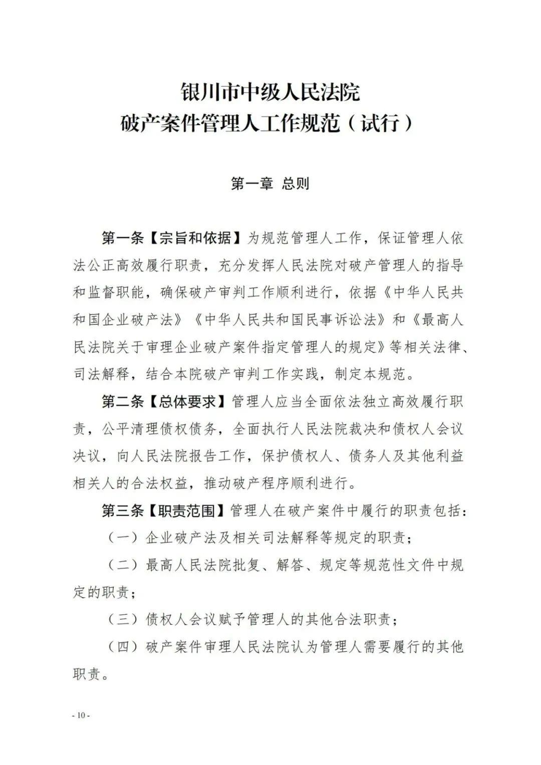 为规范管理人工作,保证管理人依法公正高效履行职责,充分发挥人民法院对破产管理人的指导和监督职能,确保破产审判工作顺利进行,银川中院制定出台了《破产案件管理人工作规范(试行)》。具体内容如下: