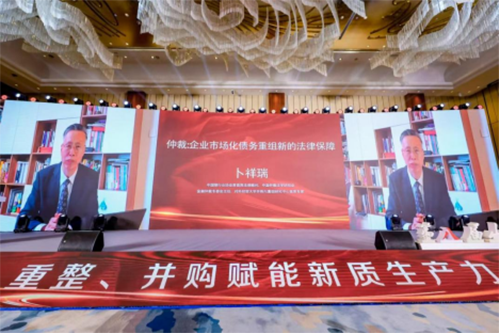 中国银行业协会原首席法律顾问、中国仲裁法学研究会金融仲裁专委会主任、对外经贸大学并购与重组研究中心首席专家卜祥瑞的发言题目为《仲裁:企业市场化债务重组新的法律保障》。卜祥瑞主任分析了仲裁在市场化债务重组中的作用,深入探讨了仲裁机制如何为企业提供更加灵活、高效的争议解决方案。他还分享了在当前经济环境下,企业如何利用仲裁手段优化债务结构,降低重组成本,从而保障债权人和债务人权益的同时,维护金融市场的稳定。最后,他提出在重整并购过程中,仲裁作为一种非诉讼解决争议的方式,如何与司法程序相辅相成,共同促进企业债务重组顺利进行的解决思路。